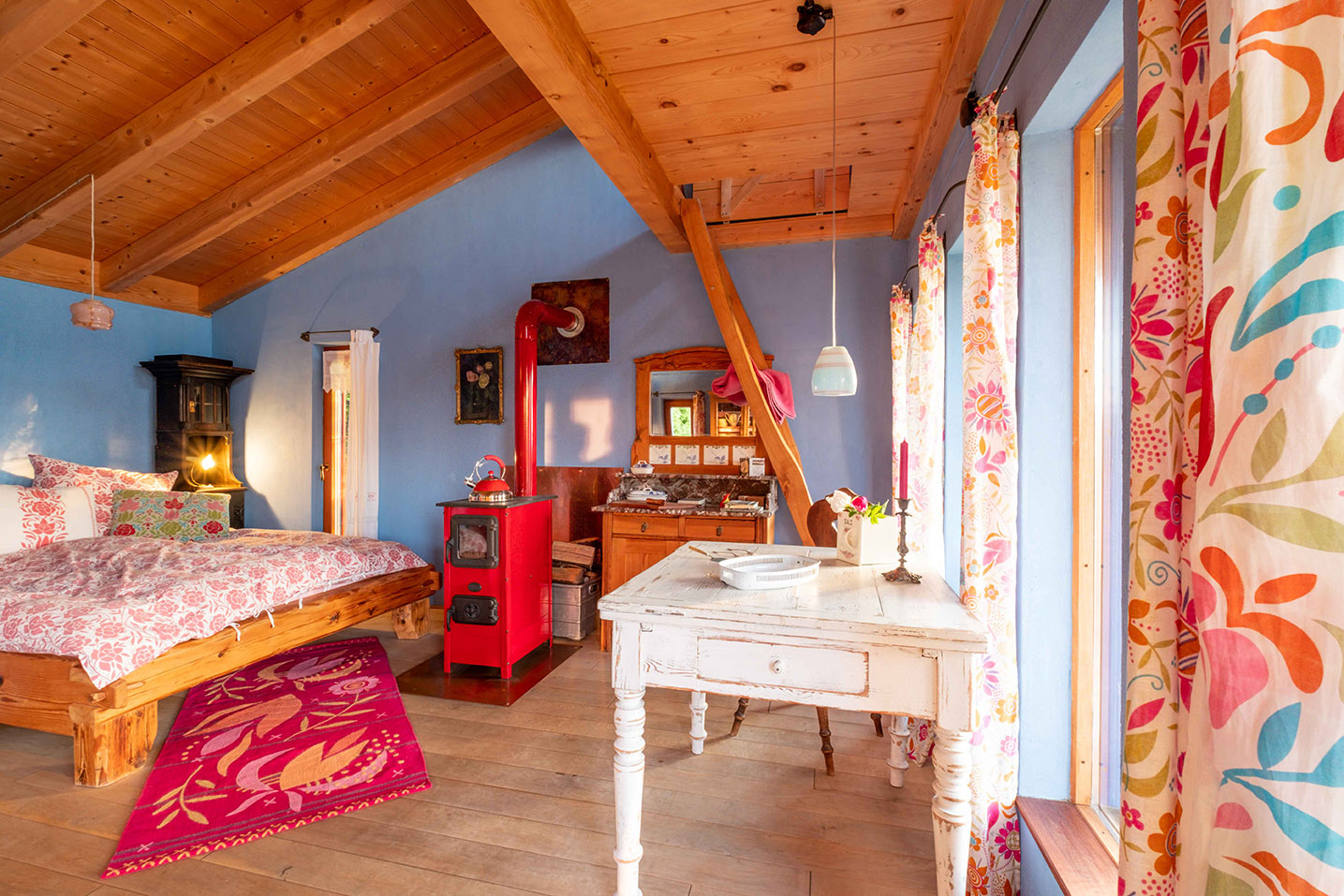 Unser Stelzenhaus in Blau-Rot steht in alter Pfahlbauweise hoch am Hang über den grünen Wiesen unseres Hofes. Das nordisch-gemütliche Holzhäuschen ist nach baubiologischen Kriterien sorgfältig in Handarbeit erstellt und mit Lehmputz ausgestattet.